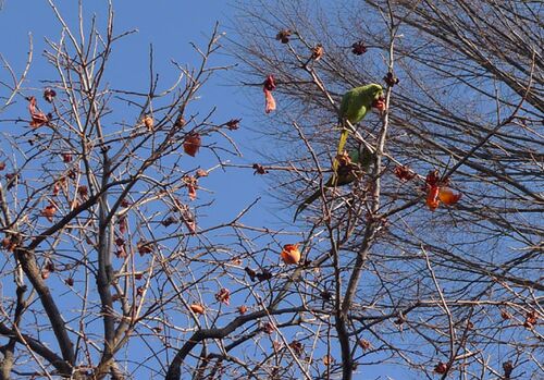 1月3日、正月もきょうで終わり。箱根駅伝の6区の決着を見てから家を出る。きのう逆転された早稲田が再び逆転。その差を広げている。 公園に行く途中、カキの木に2羽のインコ。そういえばこの季節になるとときどきこの木に止まっている。カキの実が好物なのだ…