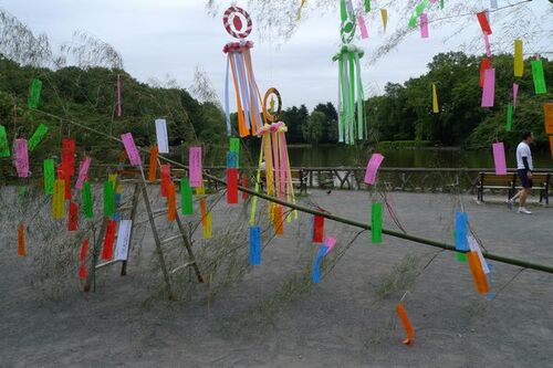 日曜日朝の善福寺公園は曇り。雲が厚い。 上池では今年も七夕飾りにいろんな願い事がつるされていた。 「サッカー選手になりたい」「勉強ができるようになりたい」などかわいい願い事に混じって、「大金持ちになりたい」とかいうのもあって書いたのは女の子…