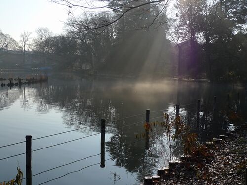 明日は大晦日という30日(火)朝の善福寺公園は晴れ。前夜の雨で地面が濡れている。 放射冷却も重なってか、けさはことのほか寒い。 川霧じゃない、池霧が立っていた。 川霧の発生メカニズムはヤカンの湯気と同じという。 水温に比べて大気の温度が低いと水…