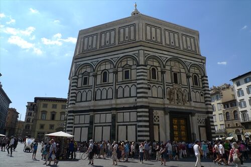 「サン・ジョヴァンニ洗礼堂」はドゥオーモ(サンタ・マリア・デル・フィオーレ大聖堂)に付属する洗礼堂で、11~12世紀に建てられた八角形の建物。 聖ジョヴァンニ(洗礼者ヨハネ)に捧げられたもので、内部の装飾はそれは見事。 内部の床は一面のモザイク模…