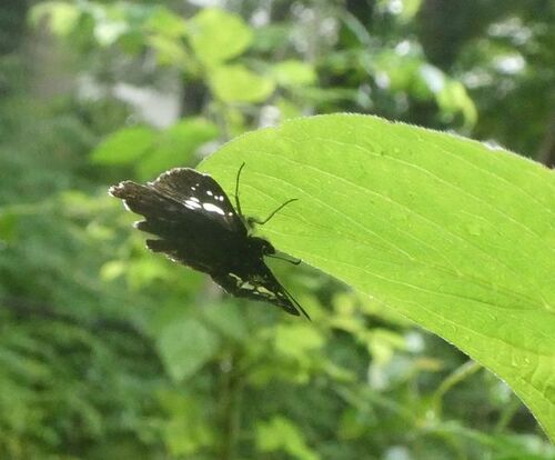 火曜日朝の善福寺公園は小雨。ときどき日が差す。 けさもセミの脱け殻が多い。 雨を嫌がってか、葉っぱの裏にチョウが止まっていた。 黒地に白帯のあるセセリチョウ、ダイミョウセセリのようだ。 下から見ると木漏れ日に照らされているようだ。 翅の模様から…