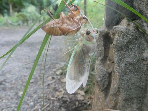 月曜日朝の善福寺公園は快晴。朝から暑い。きょう15日は終戦の日。 羽化直後のセミ。 青く白く清楚な姿。 77年前のあの日も、同じようにして羽化するセミの姿があっただろう。 上池では、カワセミのオスのブンジ(B2)くんかな。 池をめぐっていると、カワセ…