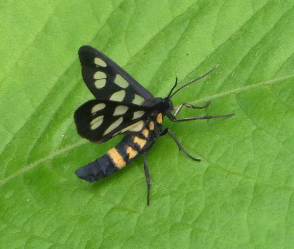翅の形や模様からしておよそガらしくなく、ドロバチに擬態しているといわれている。