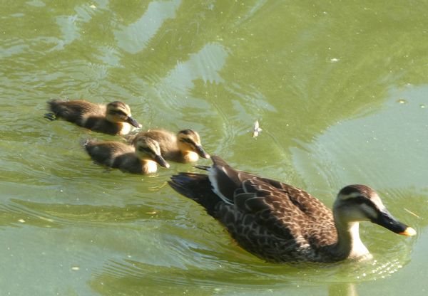 カルガモは「刷り込み」により孵化したあとに最初に見た動く物体を親とみなす習性があるから、当然、母ガモを親鳥とすぐに認識し、そのあとを追っかけ回す。親鳥を先頭に、ヒナたちが固まってついていく姿は実にほほえましい。
