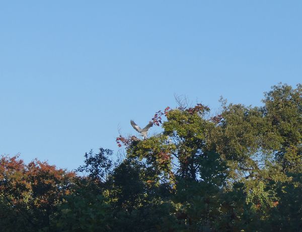 と、目を転じると、上空をアオサギが羽を広げて飛来してきて、高い木の枝に止まろうとしている。