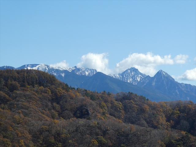 前方でも霧が発生していて、その後方の雪を頂いているのは北アルプスの山々だろうか。