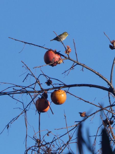 公園からの帰り道、柿の木にメジロがやってきていた。