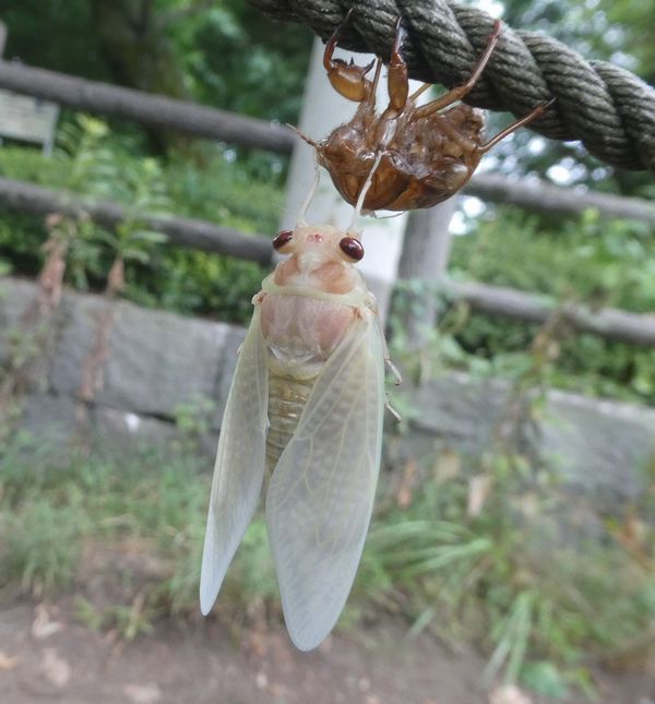 羽化したてのセミと脱け殻が1本の木に集まっている。