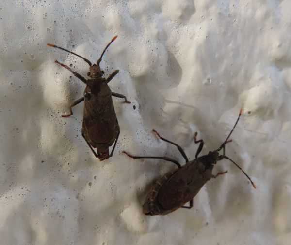 小さな黒っぽいカメムシの上に別のカメムシが乗っていて、やがて離れていった。