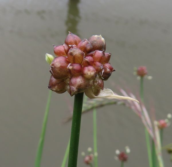 池の淵でノビル(野蒜)が伸びていて、先端に「むかご」ができている。
